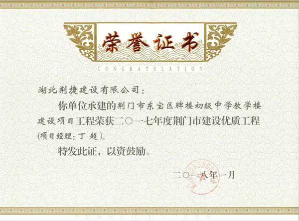 牌楼建设项目工程荣誉证书