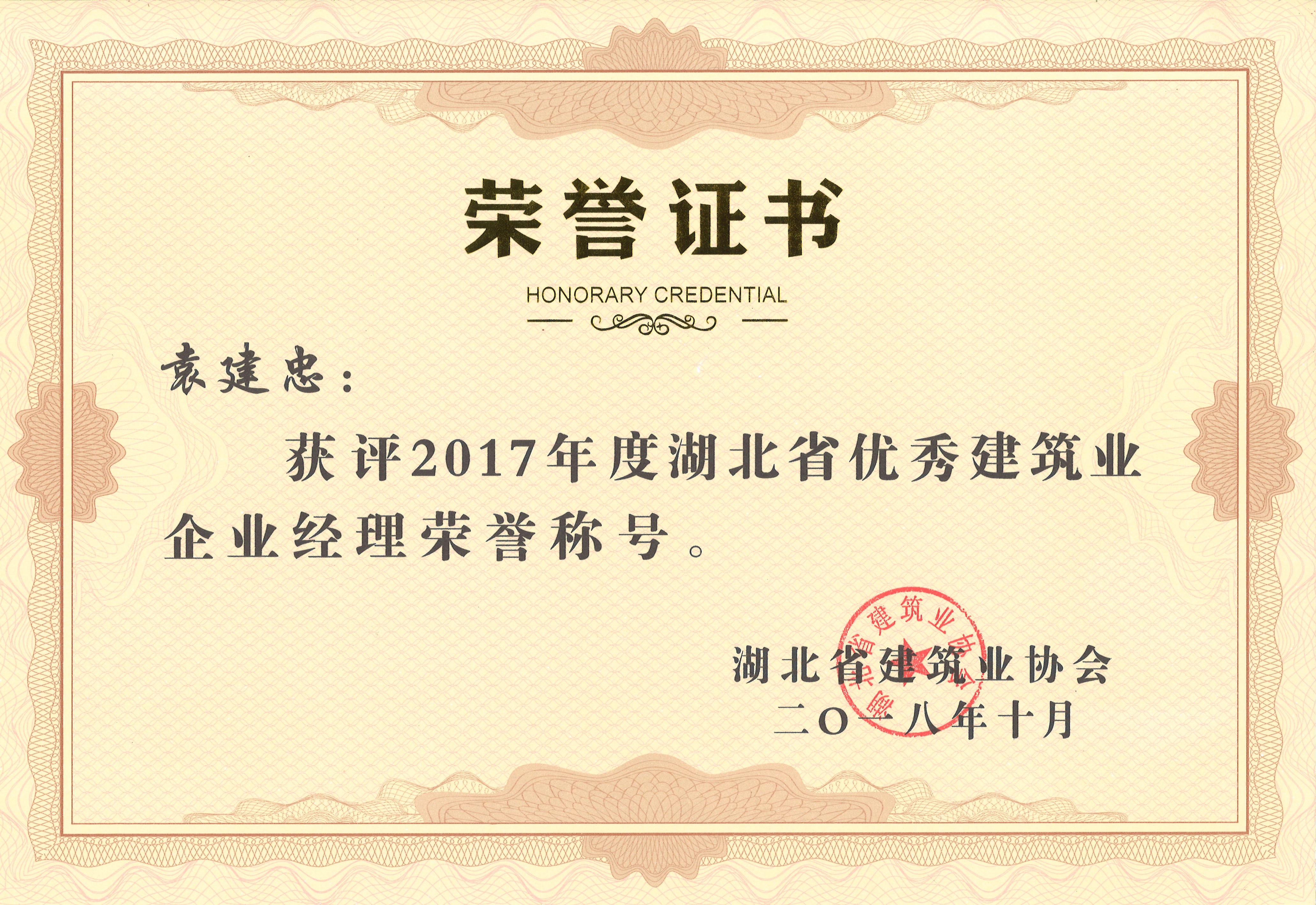 2017年度湖北省优秀建筑业企业经理
