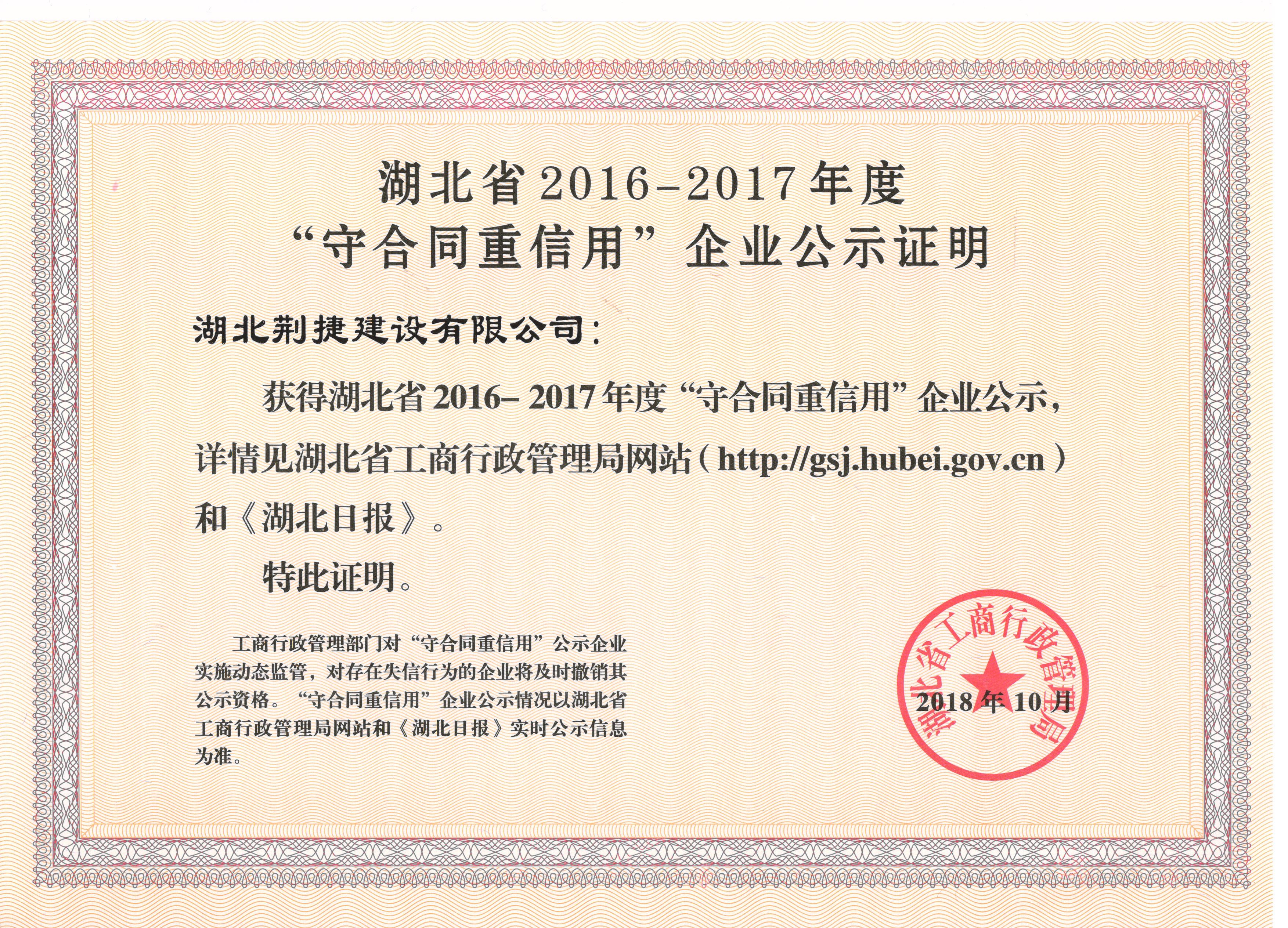 湖北省2016-2017年度“守合同重信用”企业